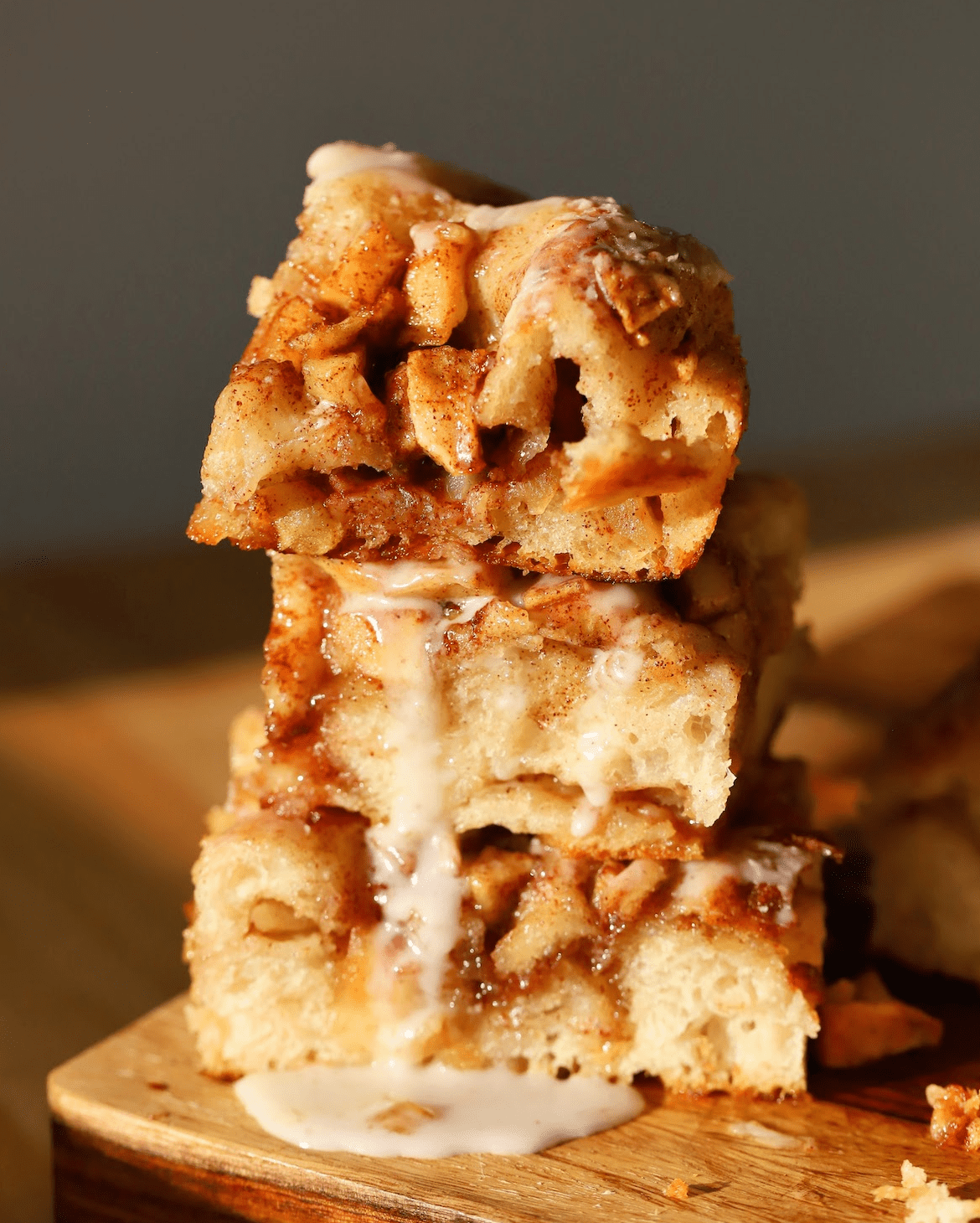 8. As the focaccia cools, make the glaze. Add powdered sugar and half and half to a large bowl. Whisk consistently with a fork until the desired consistency is reached. Add the maple extract, mix again. You may need to adjust the cream to get a nice runny glaze. Then top the warm focaccia! Slice and enjoy!